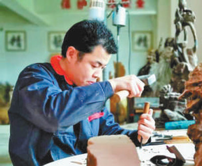 邊帶徒弟,邊練技藝。奉湘波先后獲得湖南省及全國(guó)殘疾人技能比賽的大獎(jiǎng),被評(píng)為技術(shù)能手。在一塊色澤灰暗的木墩上,刻刀上下翻飛,刀起刀落,木材特有的清香擴(kuò)散,圖案慢慢呈現(xiàn)。奉湘波給我們展示了一下精湛的技藝。