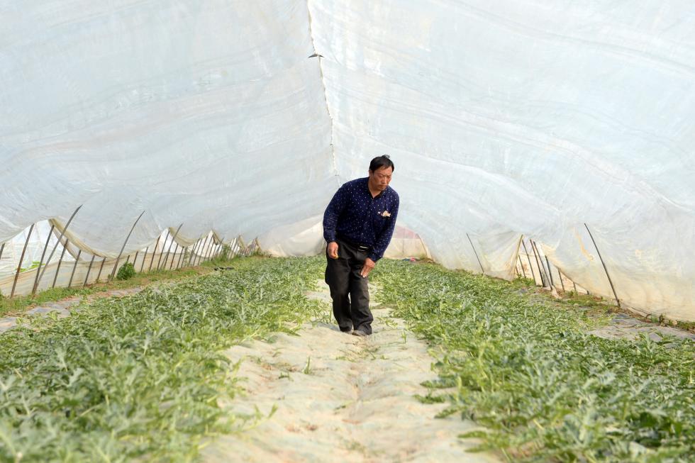 ↑4月2日,孫勇在大棚內(nèi)查看西瓜長(zhǎng)勢(shì)。