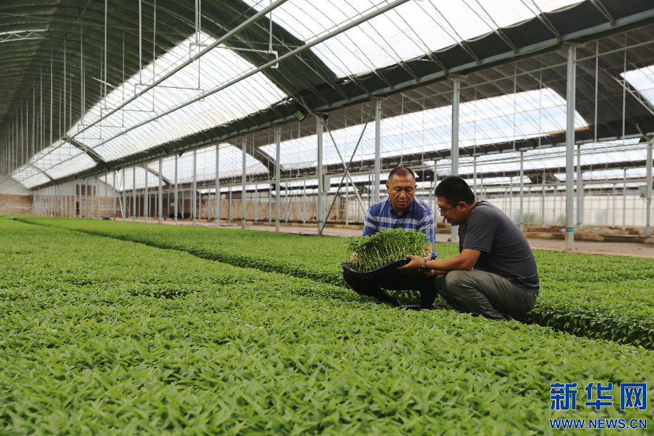6月9日,內(nèi)蒙古自治區(qū)鄂托克前旗農(nóng)民李宏(左)和兒子李鵬博在育苗大棚里查看辣椒育苗情況。新華網(wǎng) 曹楨攝