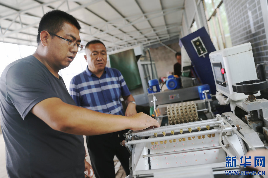 6月9日,李宏和李鵬博在廠房里操作自動播種機(jī)播種辣椒苗。新華網(wǎng) 曹楨攝