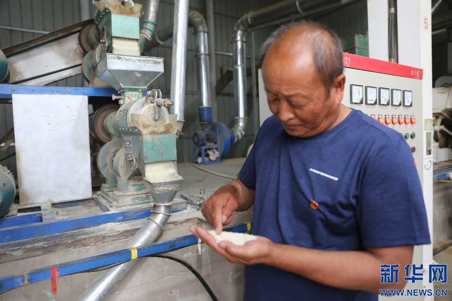 6月12日,內(nèi)蒙古自治區(qū)達(dá)拉特旗沙圪堵村農(nóng)民李清云在廠房里查看稻米加工情況。新華網(wǎng) 曹楨攝