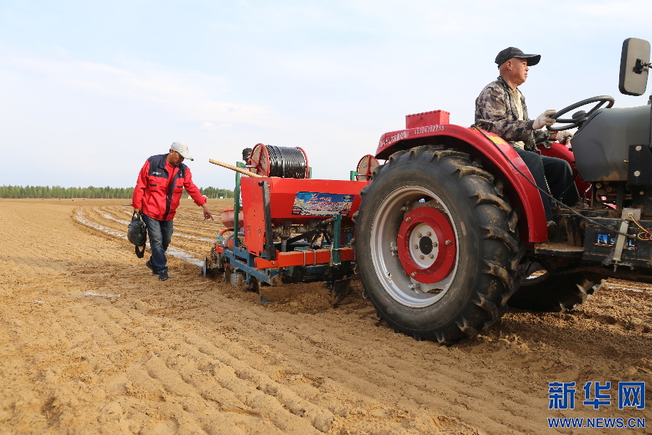 6月12日,內(nèi)蒙古自治區(qū)達(dá)拉特旗天義昌村村民趙培小(左)在地里播種葵花。新華網(wǎng) 曹楨攝