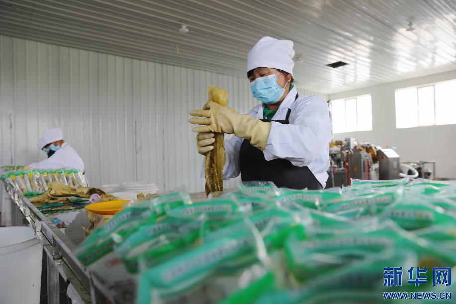 6月11日,內(nèi)蒙古自治區(qū)杭錦旗中圖村農(nóng)民米蘭在當(dāng)?shù)胤N植合作社醬腌菜生產(chǎn)加工廠工作。新華網(wǎng) 曹楨攝