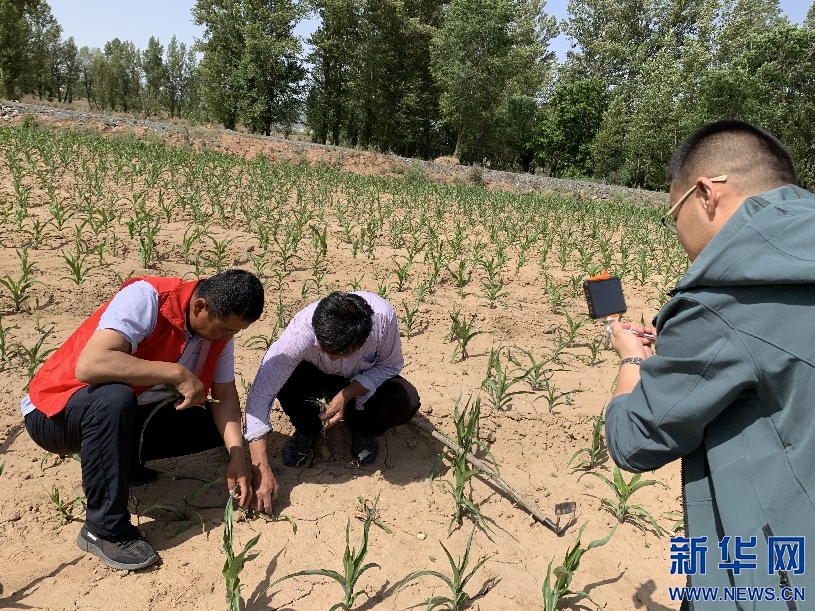 6月10日,內(nèi)蒙古自治區(qū)烏審旗無定河鎮(zhèn)農(nóng)業(yè)“土專家”在玉米地里針對小地老虎病蟲害問題,進(jìn)行線上直播,向當(dāng)?shù)剞r(nóng)民講解防治方法。新華網(wǎng) 曹楨攝