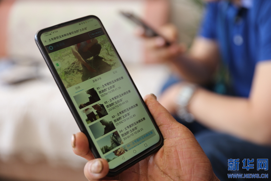 6月10日,內(nèi)蒙古自治區(qū)烏審旗無定河鎮(zhèn)農(nóng)民石秀榮通過手機(jī)收看“土專家”技術(shù)指導(dǎo)直播。新華網(wǎng) 曹楨攝