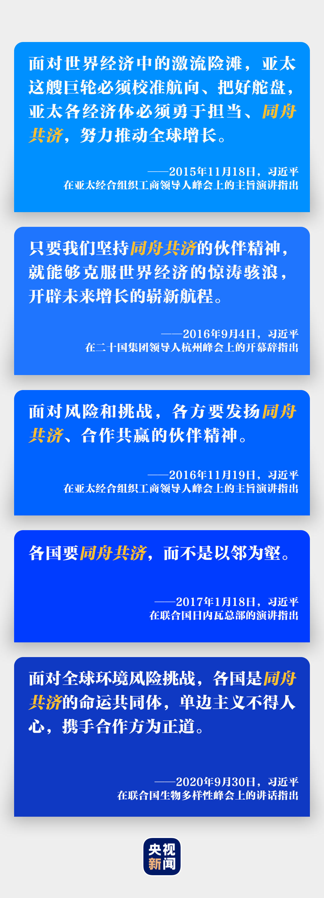 兩年前的11月17日,習(xí)近平出席亞太經(jīng)合組織工商領(lǐng)導(dǎo)人峰會(huì),在主旨演講中,他強(qiáng)調(diào)“我們同在一條船上,一起謀劃發(fā)展合作,具有特別的意義”,提出要“握穩(wěn)舵盤、把準(zhǔn)航向、齊力劃槳、乘風(fēng)破浪”。他還多次在多邊組織峰會(huì)、聯(lián)合國系列高級別會(huì)議等場合呼吁“同舟共濟(jì)”。