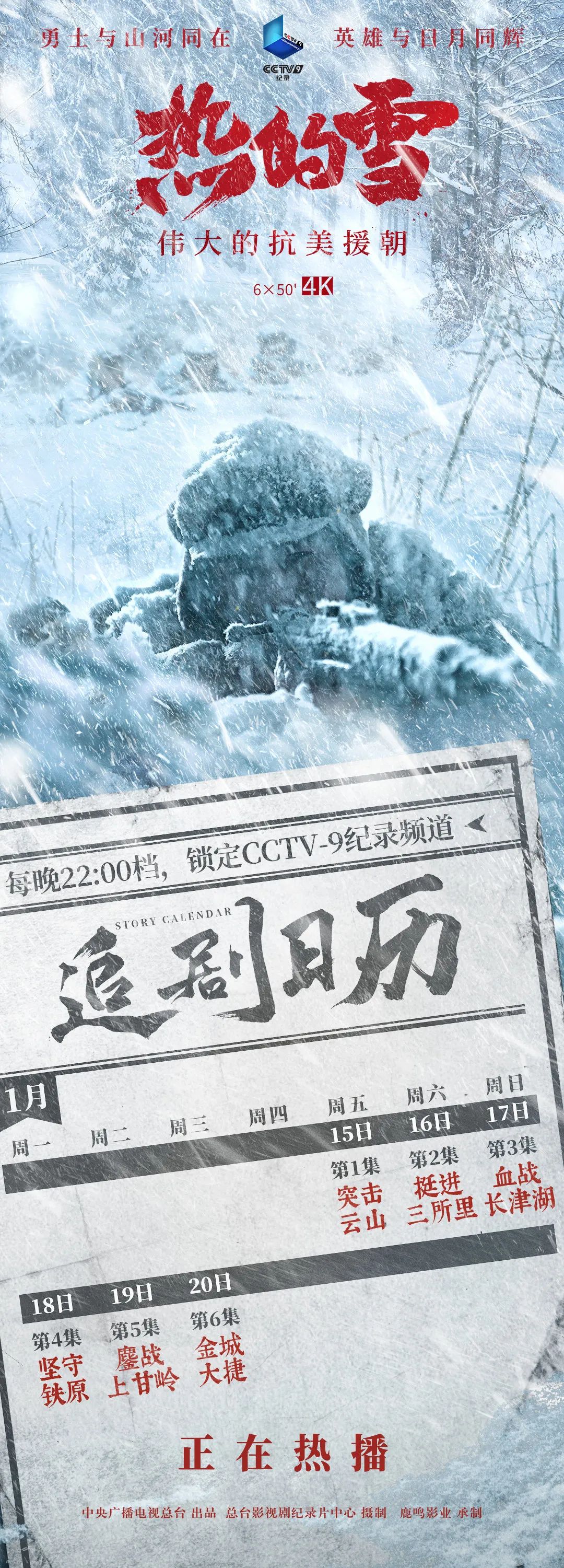 鎖定CCTV-1黃金檔,《跨過鴨綠江》正在熱播,CCTV-9晚22:00檔,紀錄片《熱的雪》接力講述抗美援朝英雄故事!影視劇傳情,紀錄片存真,偉大的抗美援朝精神,讓我們一起銘記、傳承!