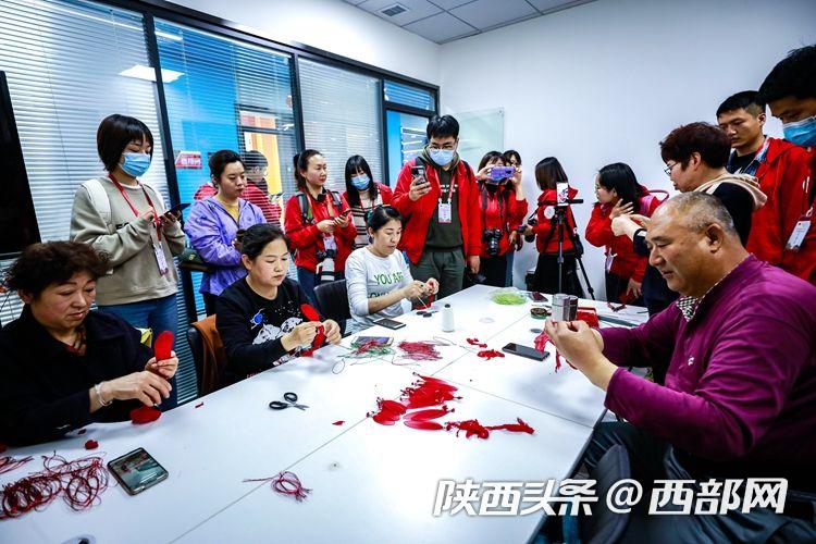 西部網(wǎng)訊(記者 劉望) 一折、一卷、六朵花瓣整齊羅列,細鐵絲緊緊繞圈固定,一朵火紅的手工花便成型了!斑@個是我們的一些手工藝品,都是有延安特色的,如果你們想學(xué)的話,隨時來,我們這里免費培訓(xùn)!3月30日,在延安市寶塔區(qū)電商直播融合孵化服務(wù)中心的直播間里,60歲的退休工人董智玲正在直播間里給網(wǎng)友直播手工藝品制作,引來了眾多記者的圍觀。