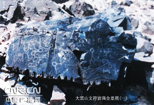 最具代表性的一幅是大黑山頂面朝南的一塊獨立巖石,在兩平方米的巖石上刻畫出形態(tài)各異的文符個體30多個。比龍山文化陶文符多19個字,是國內(nèi)迄今為止史前陶(石)遺存文符字數(shù)最多的一塊。它向后人展示了文字由初始的象形圖畫,轉(zhuǎn)變?yōu)橛卸喾N符號組織的抽象化圖文,用來表達較為復(fù)雜的抽象概念。經(jīng)判定,此文符既不是新時期早期寫實圖畫,又不是西方遍體音符號,也不是中國方塊漢字符號,初步推測可能是甲骨文應(yīng)用之前的過度符號。