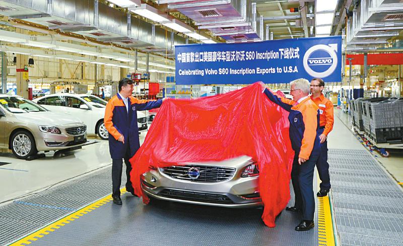 ①中國首款出口美國豪華車型沃爾沃S60轎車在成都龍泉汽車城下線。