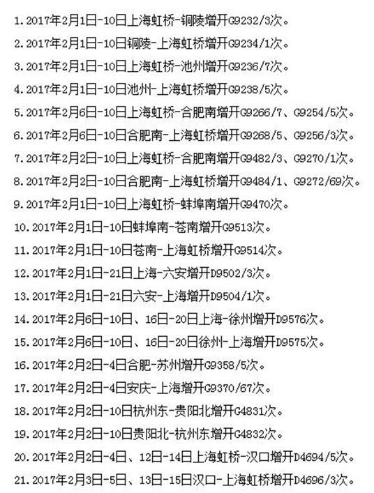 上海鐵路局說,從2月1日-2月21日,上海鐵路局將增開部分上海至銅陵、池州、合肥、蚌埠等地及往返的多趟列車。