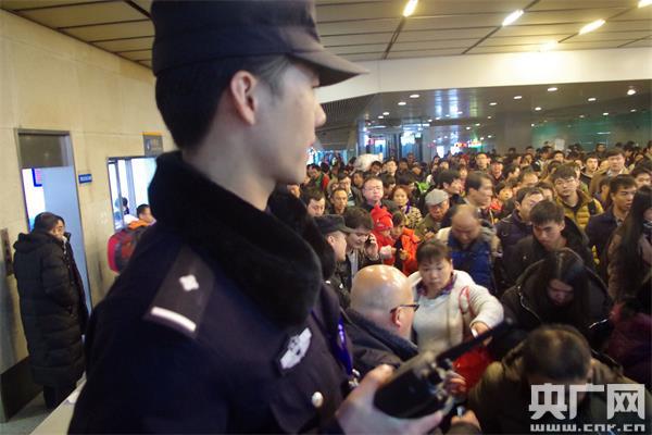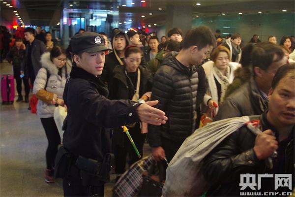 上海鐵路公安處民警在鐵路上海南站出口處維護(hù)旅客出站秩序