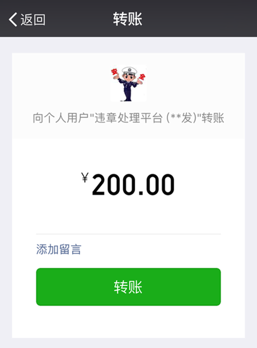 記者注意到,這張標注為“2月22號”的“違停單”上煞有其事地寫下車輛號牌,并寫有違法時間、地點等信息,但在對違停行為的描述中標注的卻是所謂“亂!保屓丝扌Σ坏玫氖,這張所謂的“違停單”還寫道,如逾期不處理將被“處于”3%滯納金,令人無語。掃描這張“假罰單”上面的二維碼,直接跳轉到一個轉賬頁面,收款人是一個頭像為“違章處理平臺”字樣的微信個人賬戶。記者了解到,上海公安交警部門一直使用《上海市公安局違法停車告知單》,至今從未使用過類似的二維碼繳款告知單。