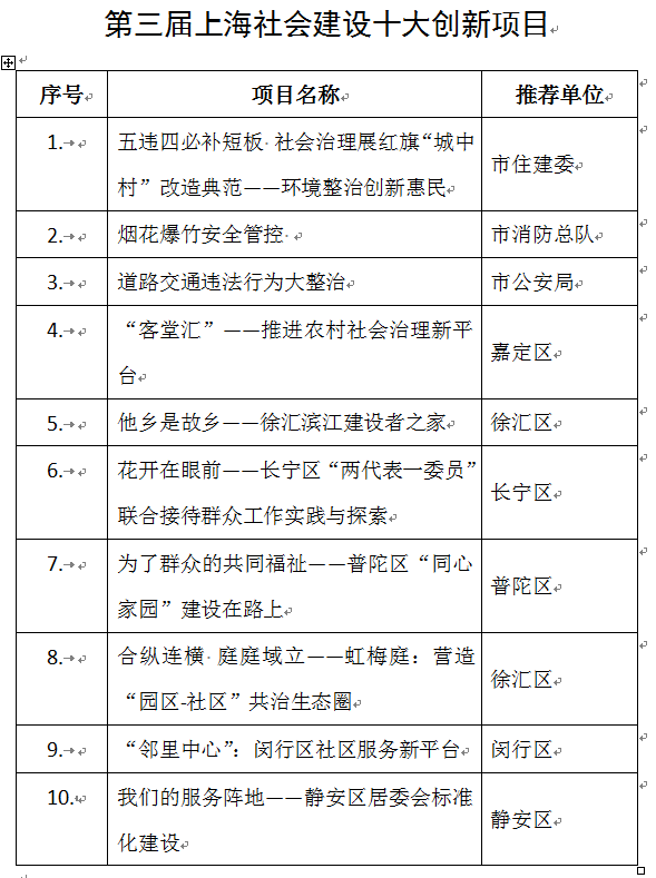 入選的十大創(chuàng)新項目,既有圍繞本市中心大局正在推進(jìn)的重點項目,如煙花爆竹安全管控、道路交通違法行為大整治、“城中村”改造等,也有貼近民生和基層的治理典型,如靜安區(qū)居委會標(biāo)準(zhǔn)化建設(shè)、徐匯濱江建設(shè)者之家、虹梅庭“園區(qū)-社區(qū)”共治生態(tài)圈、農(nóng)村社會治理新平臺“客堂匯”等。