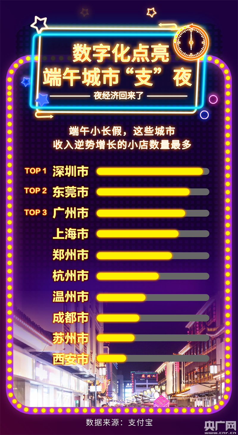 小店數(shù)字化程度越高的城市,夜經(jīng)濟(jì)越活躍。支付寶數(shù)據(jù)顯示,端午夜間,深圳、東莞、廣州、上海、鄭州、杭州、溫州、成都、蘇州、西安這十個城市收入逆勢增長的小店最多。
