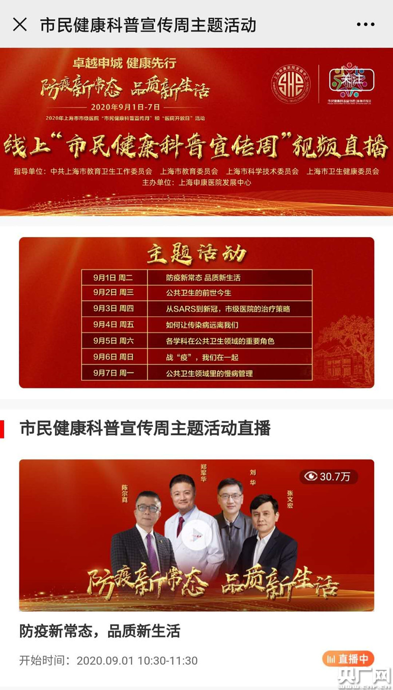 9月2日至7日期間,每日推送一個科普話題,以直播形式進(jìn)行科普宣傳,申康中心官網(wǎng)同步發(fā)布。通過圖文推送、視頻分享、在線直播等多種形式,匯集形成一份系統(tǒng)化、規(guī);摹笆忻窠】抵R菜單”,借助新媒體形式進(jìn)行線上展播,不斷推進(jìn)上海市級醫(yī)院智慧科普、精準(zhǔn)科普。