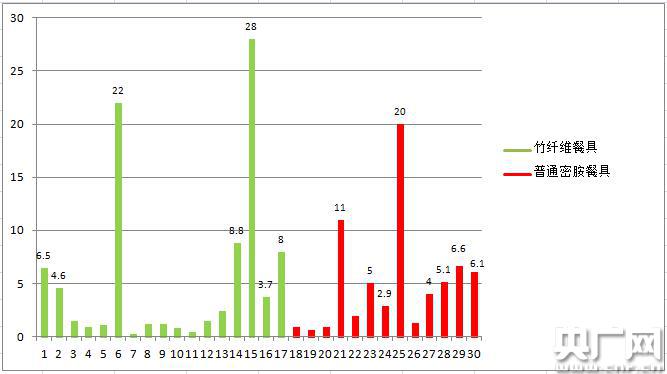 表一 4%乙酸環(huán)境下竹纖維餐具與普通密胺餐具部分測試指標和數(shù)據(jù)對比