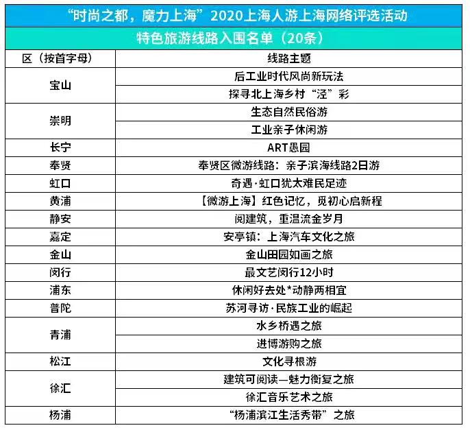央廣網(wǎng)上海11月24日消息(記者楊靜 林馥榆)由上海市文化和旅游局主辦的2020“上海人游上海”活動自今年5.19中國旅游日啟動至今,覆蓋了全市16個區(qū),圍繞五個一百及上海旅游節(jié)等相關(guān)主題,推出了眾多精品線路及惠民活動。