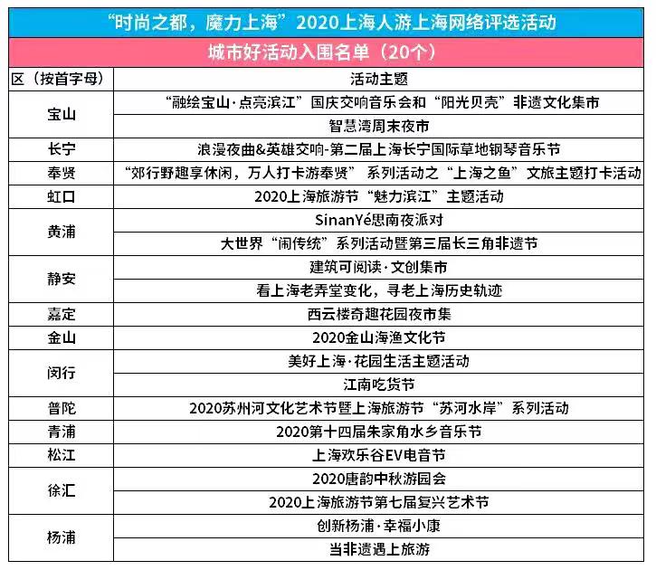 為了對全年活動進行總結(jié)與回顧,也為更好的在2021年推出新活動,展現(xiàn)新面貌,特開展“時尚之都,魔力上!2020“上海人游上!本W(wǎng)絡(luò)評選活動,借助東方網(wǎng)平臺,評選出“上海市民最喜歡的微游上海特色旅游線路”和“最受上海市民歡迎的城市好活動”。