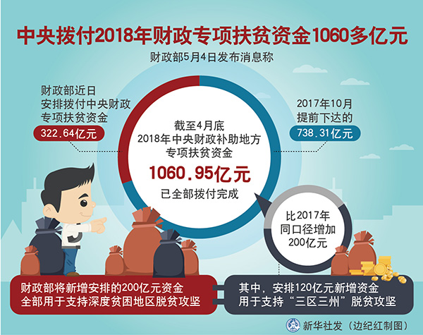財政部4日發(fā)布消息稱,財政部近日安排撥付中央財政專項扶貧資金322.64億元,加上2017年10月提前下達的738.31億元,截至4月底,2018年中央財政補助地方專項扶貧資金1060.95億元已全部撥付完成,比2017年同口徑增加200億元。