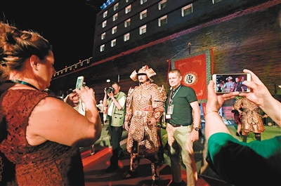 仿唐入城儀式結(jié)束后,游客和“武士”合影。記者 張宇明 攝