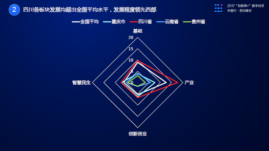 四川省的互聯(lián)網(wǎng)+數(shù)字經(jīng)濟基礎指數(shù)、產(chǎn)業(yè)指數(shù)、創(chuàng)新創(chuàng)業(yè)指數(shù)、智慧民生指數(shù)均取得了長足、均衡發(fā)展。四大板塊的發(fā)展均超出全國平均水平,并領先于重慶、云南、貴州。特別是產(chǎn)業(yè)指數(shù),領先優(yōu)勢尤為明顯。