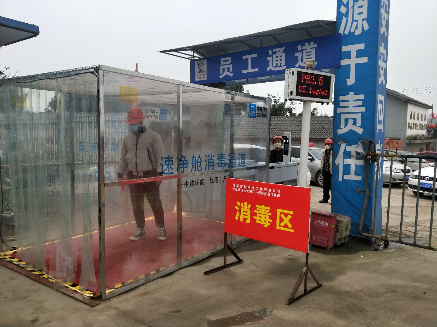 成都大邑縣污水處理廠提標(biāo)-擴(kuò)能項(xiàng)目門(mén)口,工人進(jìn)入工地需走過(guò)“速凈艙”消毒通道消毒。(項(xiàng)目工地供圖 央廣網(wǎng)發(fā))