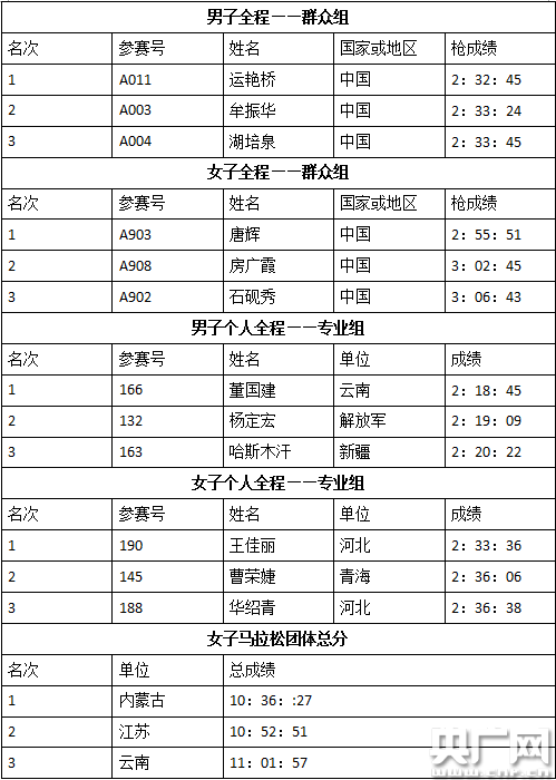 29日上午,第十三屆全運(yùn)會(huì)馬拉松比賽在武清鳴槍開跑,值得注意的是,本屆全運(yùn)會(huì)首次增設(shè)群眾組馬拉松,進(jìn)入前三,男女馬拉松全程群眾組選手均可獲得金銀銅牌的獎(jiǎng)勵(lì)。經(jīng)過近三個(gè)小時(shí)的角逐,來自山東省淄博市的運(yùn)艷橋以兩小時(shí)三十二分四十五秒的成績(jī)奪得男子全程群眾組的冠軍,唐輝則以兩小時(shí)五十五分五十一秒的成績(jī)摘得女子全程群眾組的金牌。此外,董國(guó)建、王佳麗分別摘得專業(yè)組男子、女子全程個(gè)人冠軍。內(nèi)蒙古隊(duì)收獲女子馬拉松團(tuán)體總分第一名的成績(jī),將女子團(tuán)體金牌收入囊中。