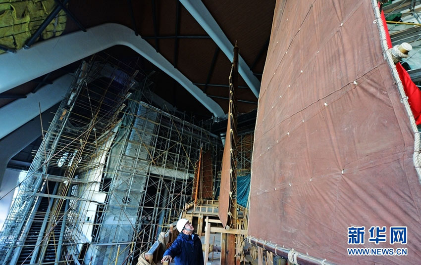 圖為國家海洋博物館“宋元福船”模型。新華網(wǎng)發(fā)(史淞予 攝) 12月16日,從國家海洋博物館獲悉,我國完整復原古船的珍貴展品,堪稱海洋文化國寶級館藏的“宋元福船”復原項目主體通過驗收。 據(jù)了解,船型設(shè)計參考了中國古代船舶技術(shù)的相關(guān)文獻考證及研究、考古發(fā)掘出土的典型古船及配置資料以及現(xiàn)代傳統(tǒng)木質(zhì)帆船制造工藝。