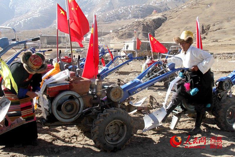 3月16日,西藏拉薩市娘熱鄉(xiāng)加爾西村舉行春耕春播。圖為村民在拖拉機掛上“吉祥哈達”。吳雨仁 攝