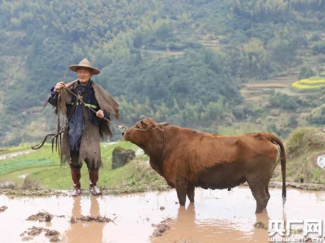 在春耕現(xiàn)場,開犁之前,村里的村民要用包著松樹針葉汁的糯米麻糍去喂牛,意思是“開犁祭!薄!斑@樣做一方面給牛加力以示酬謝,一方面預(yù)兆今年農(nóng)作物大豐收。在‘開犁祭!,還要用牛拉犁開始耕田翻土。等犁好田,我們還要繼續(xù)用牛拉耖去平整新翻的泥土,為播撒谷種做準(zhǔn)備。平整好后,再用四齒耙糊好田埂,以便加固防漏”,當(dāng)?shù)卮迕裣蛴浾呓榻B道。