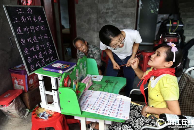13歲的“輪椅女孩”汪凌瑩,從小遺傳母親的脆骨癥,無法站立行走,也無法上學。從2014年開始,一支由淳安浪川鄉(xiāng)雙源完全小學的12名鄉(xiāng)村教師組成的送教隊伍,每周輪流為汪凌瑩送課上門,近三年來風雨無阻。這12位教師中,有到了退休年齡的老教師,也有剛剛加入教師隊伍的年輕90后!