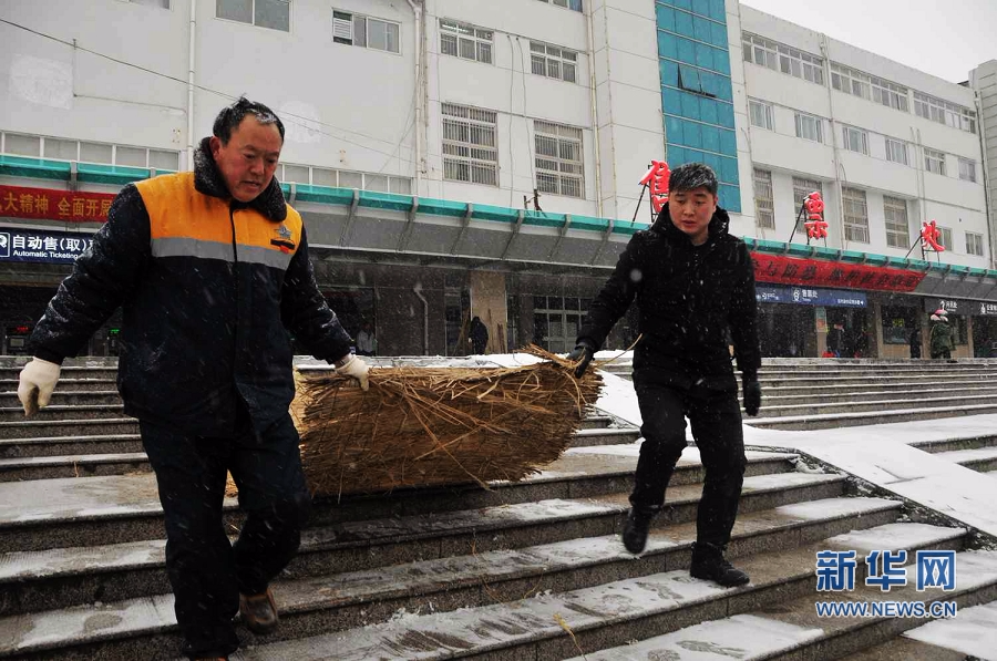 商丘火車站組織貨運(yùn)部門休班干部職工,到售票廳、進(jìn)站口等旅客密集場所鋪設(shè)草甸,防止旅客滑到摔傷。